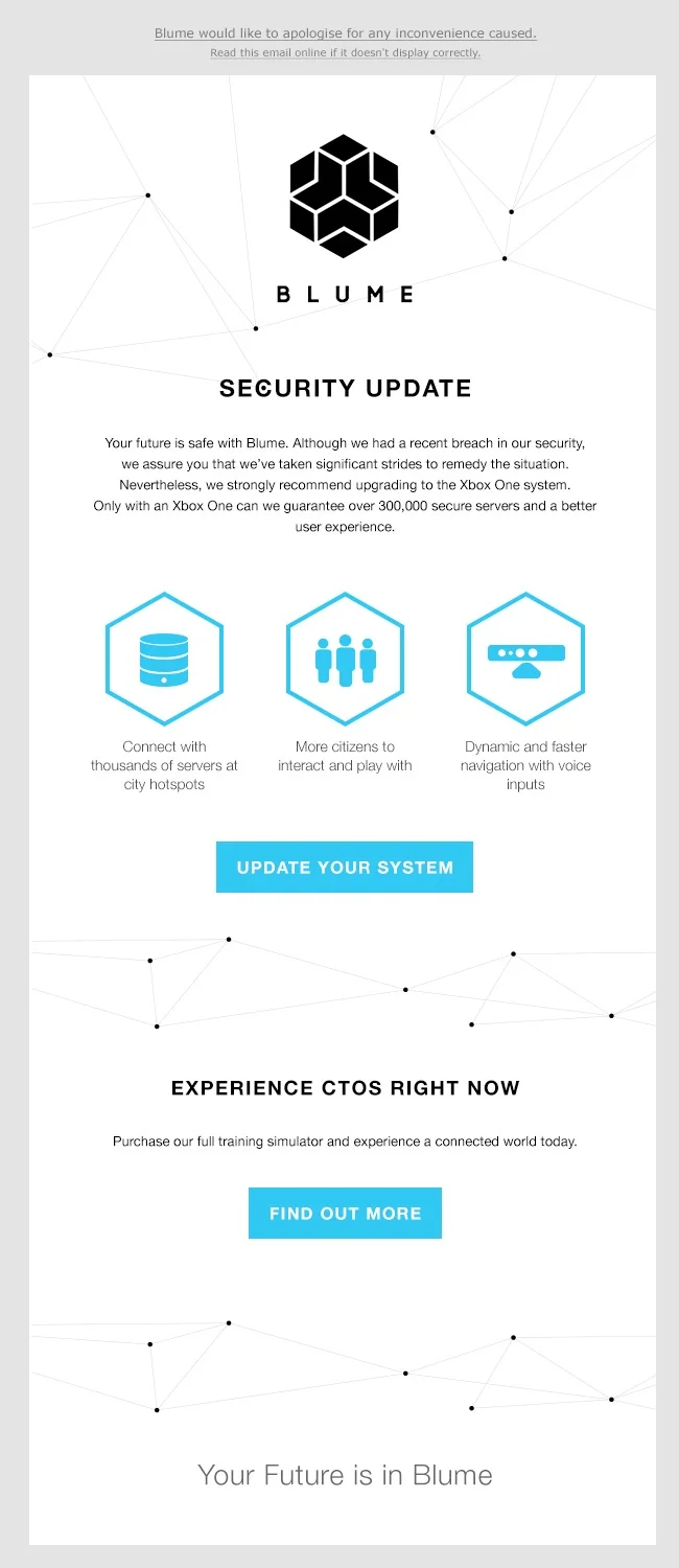 This email campaign positions the reader between the two opposing factions in the game. An apparently well-intention tech company out of silicon valley called Blume, and the anti-authoritarian (and disenfranchised) hacker group DedSec.